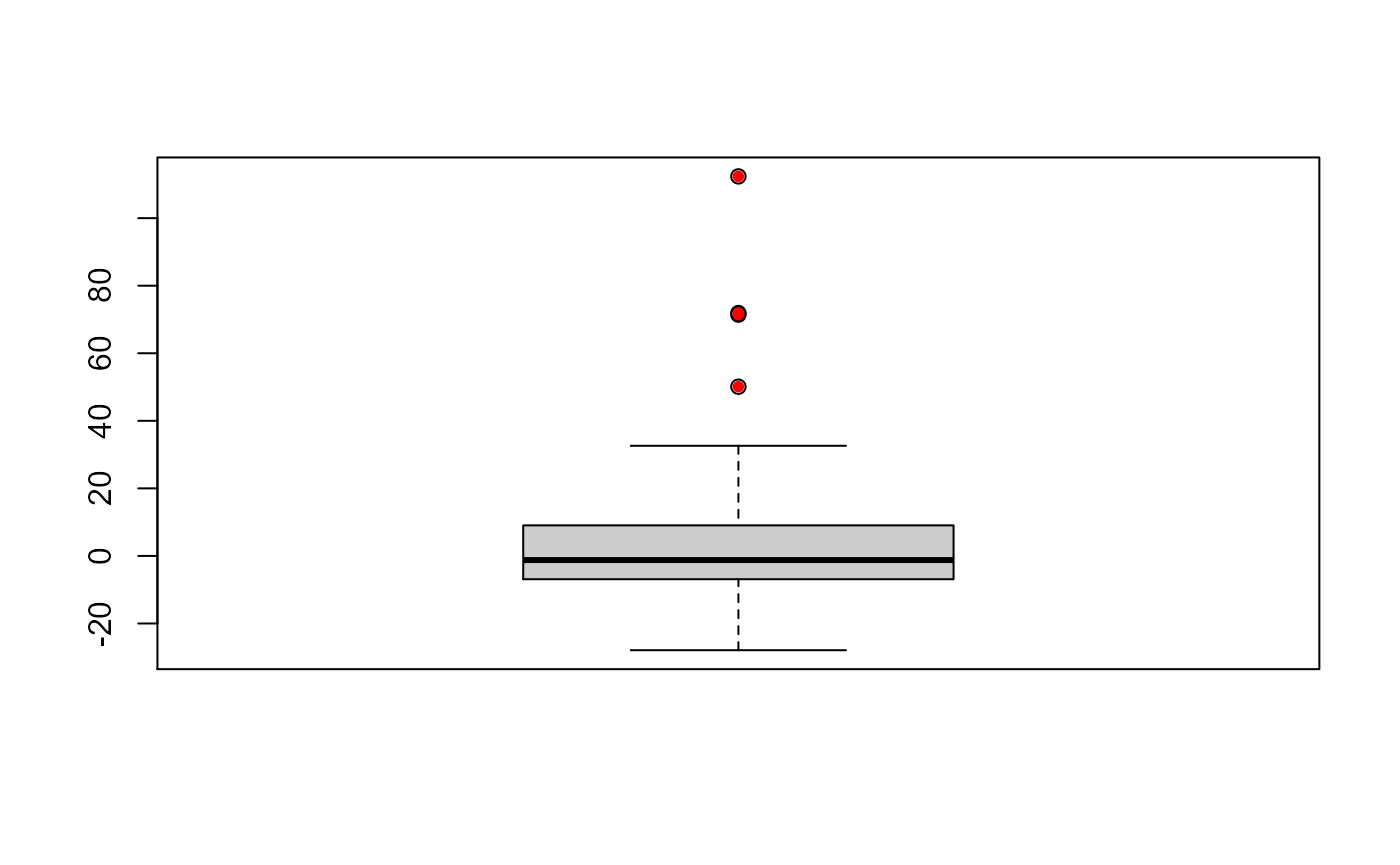 Since residuals from a robust fit can generally be used to detect the presence of atypical observations in the training data, we plot the boxplot of the residuals obtained by the robust fit and 4 possible outlying points (indicated with red circles) can be observed.