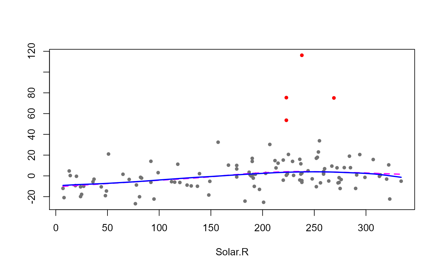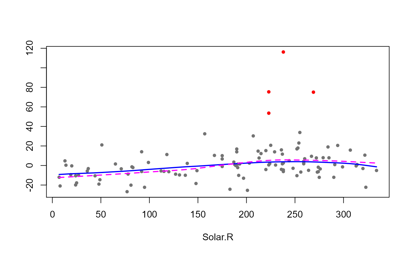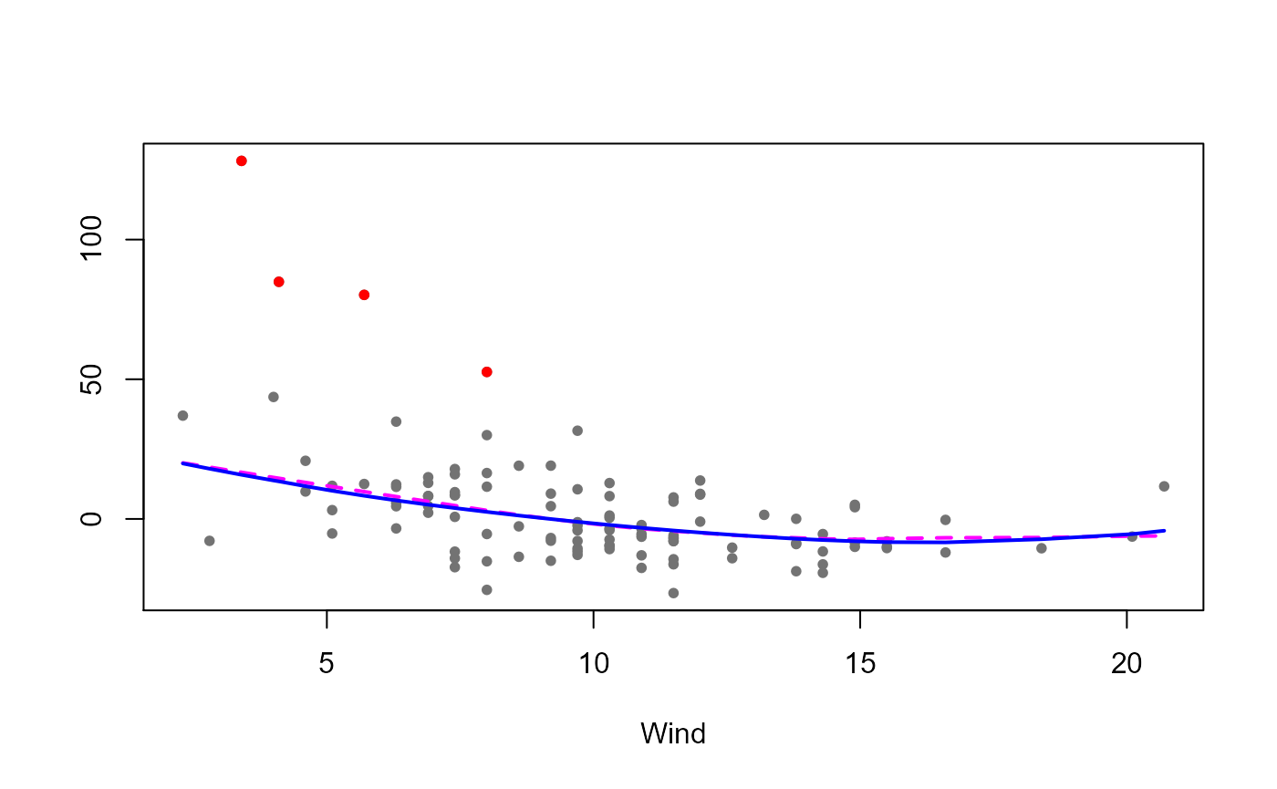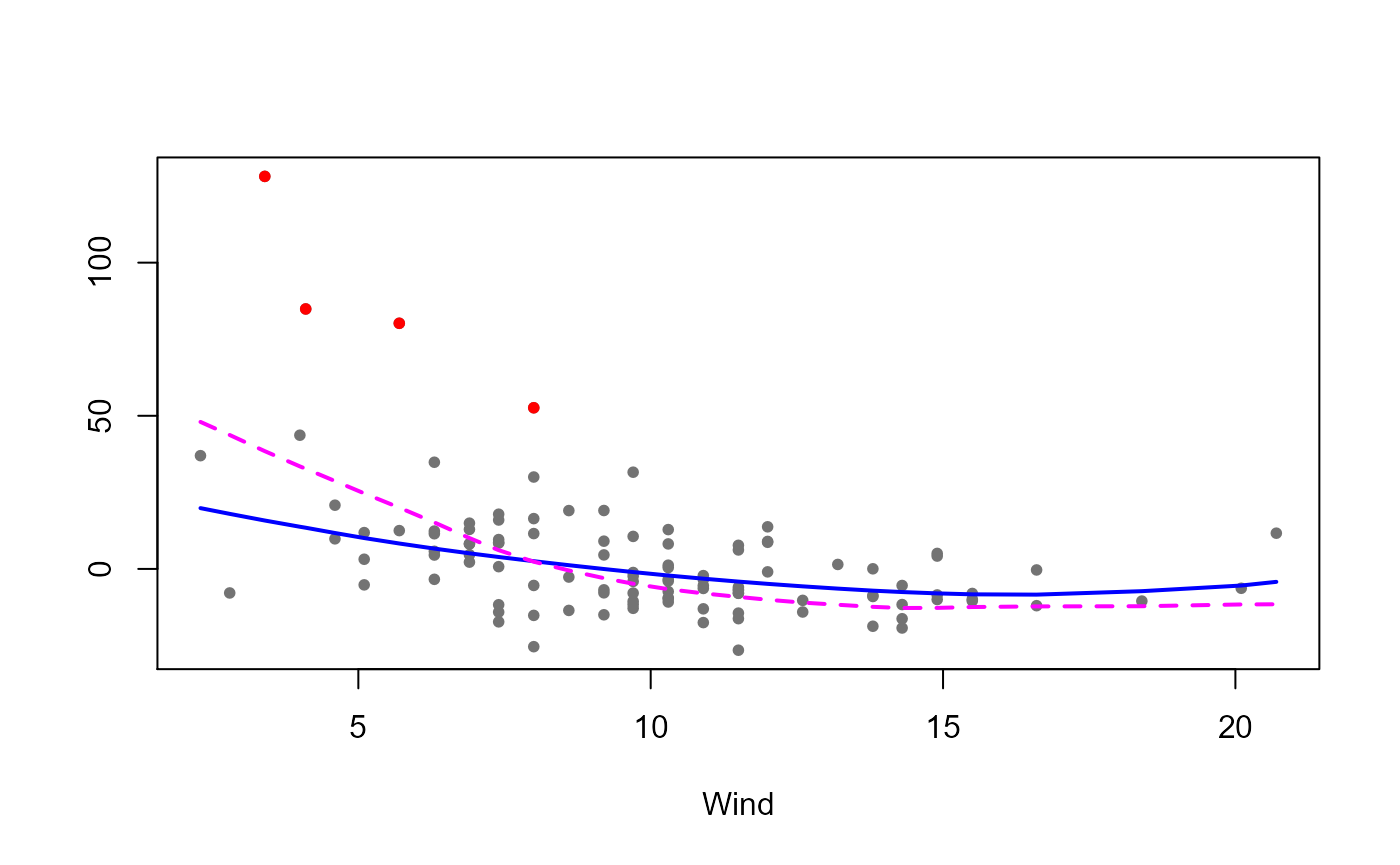 lo(Temp, span=.3), data=airclean) The following plot shows the estimated curves obtained with the classical estimator using the clean data together with the robust ones (computed on the whole data set). Outliers are highlighted in red.