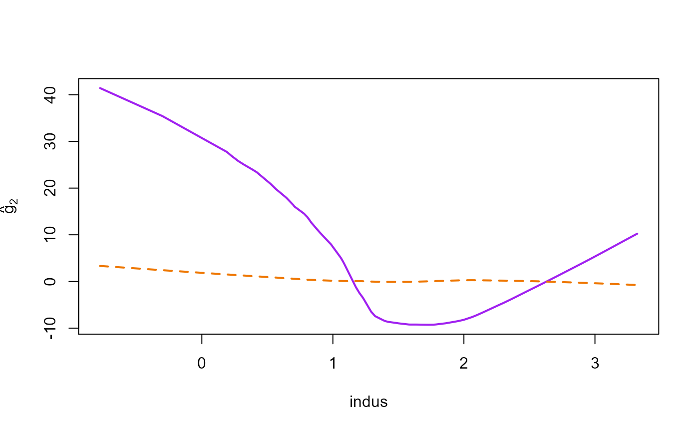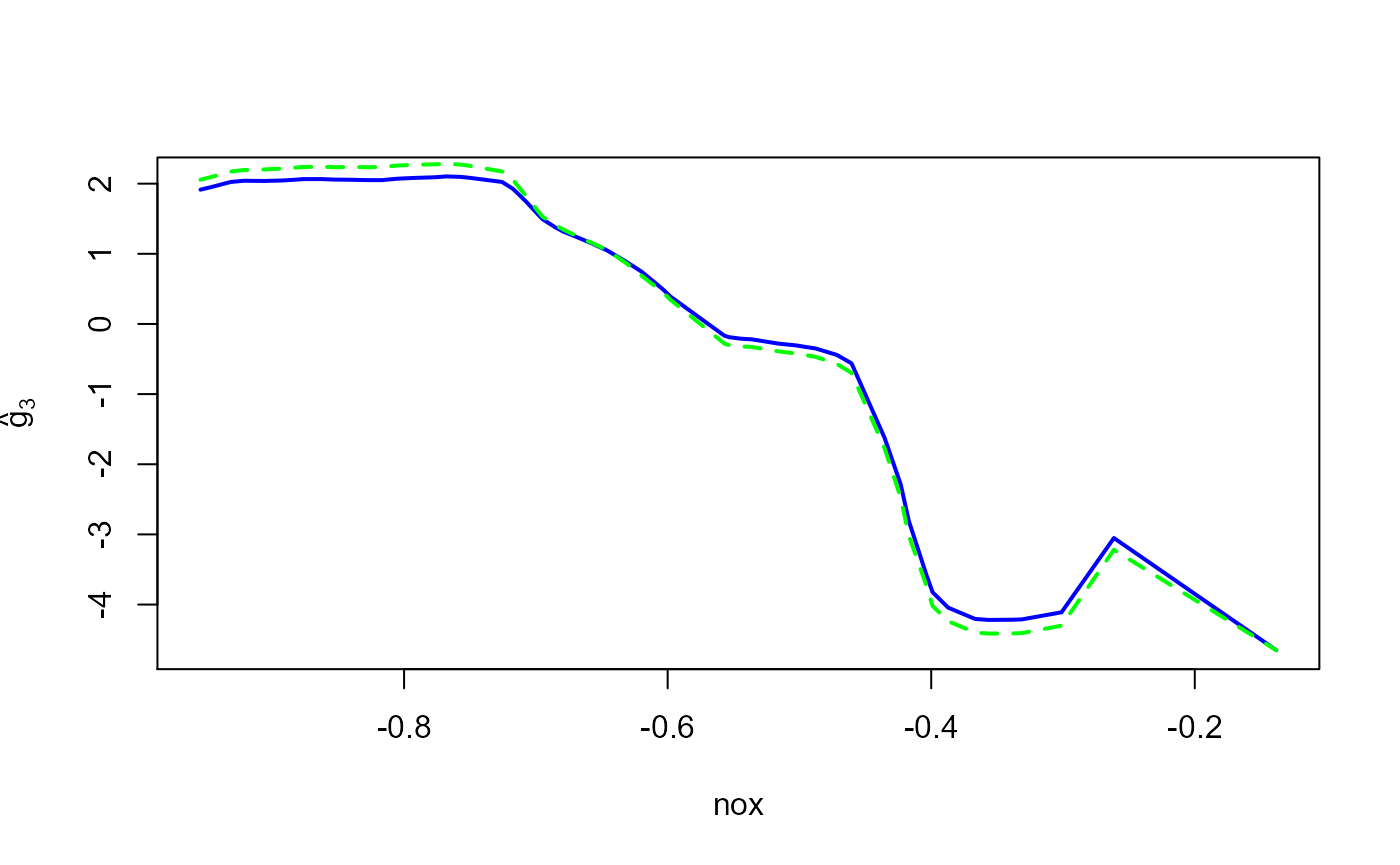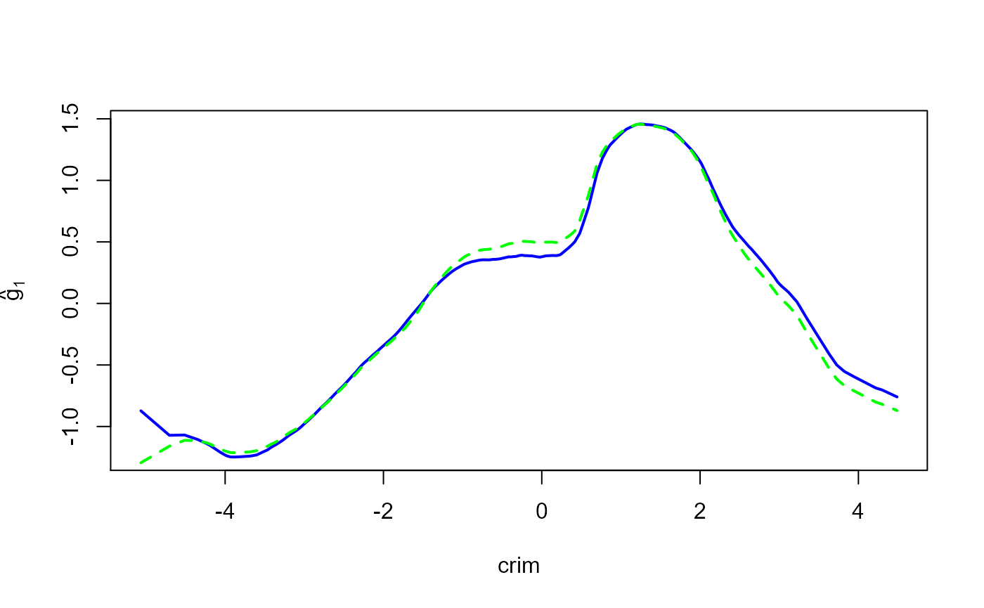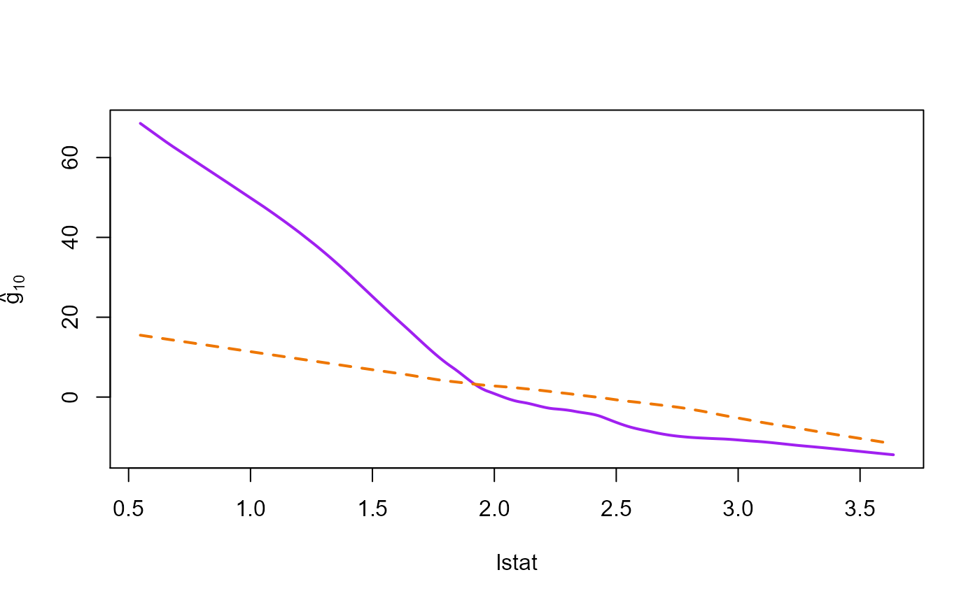 crim: per capita crime rate by town (\(X_1\)),indus: proportion of non-retail business acres per town (\(X_2\)),nox: nitric oxides concentration (parts per 10 million) (\(X_3\)),rm: average number of rooms per dwelling (\(X_4\)),age: proportion of owner-occupied units built prior to 1940 (\(X_5\)),dis: weighted distances to five Boston employment centers (\(X_6\)),tax: full-value property tax rate per 10,000 (\(X_7\)),ptratio: pupil-teacher ratio by town (\(X_8\)),black: \(1,000(Bk-0.63)^2\) where \(Bk\) is the proportion of people of Afrom American descent by town (\(X_9\)),lstat: percent lower status of population (\(X_{10}\)).The response variable \(Y\) is medv, the median value of the owner-occupied homes in 1,000 USD, and the proposed additive model is \[Y= \mu+ \sum_{j=1}^{10} g_j(\log(X_j))+ \epsilon.\] where \(\mu \in \mathbb{R}\), \(g_j\) are unknown smooth functions, and \(\epsilon\) are random errors.