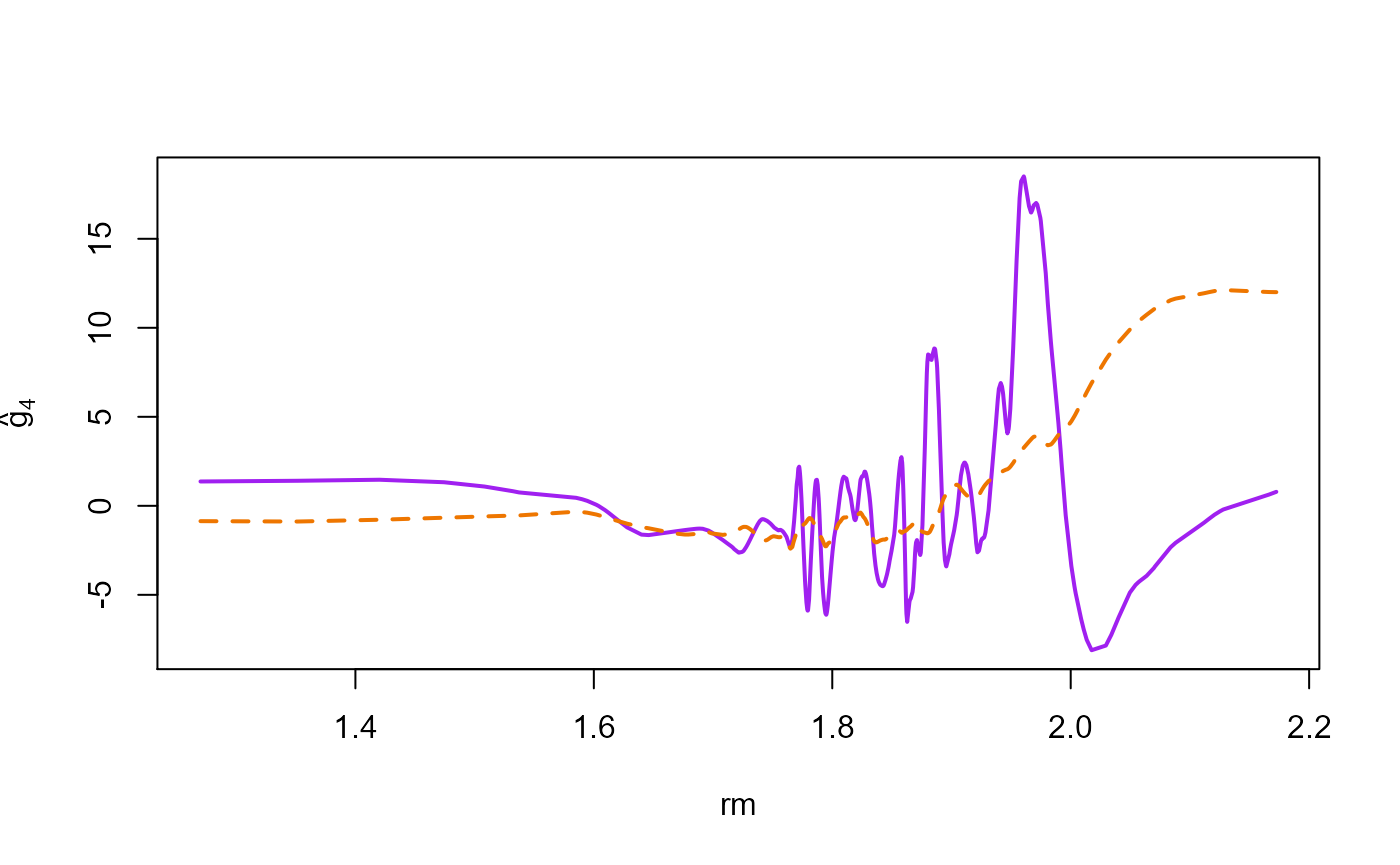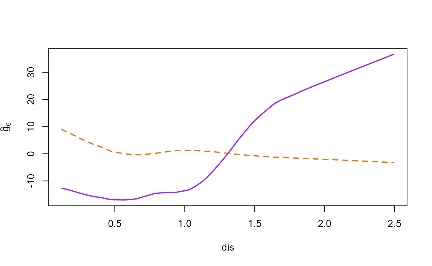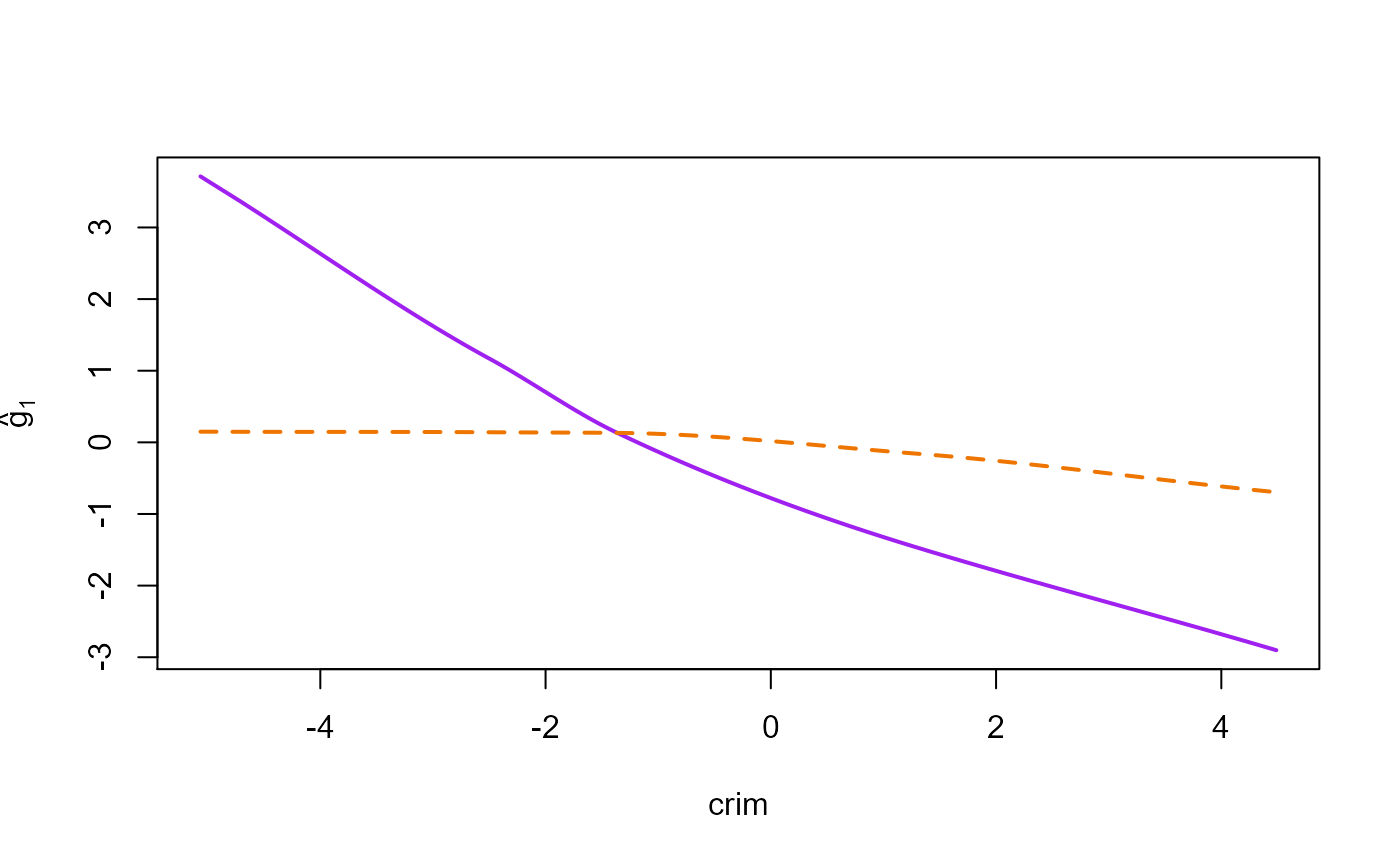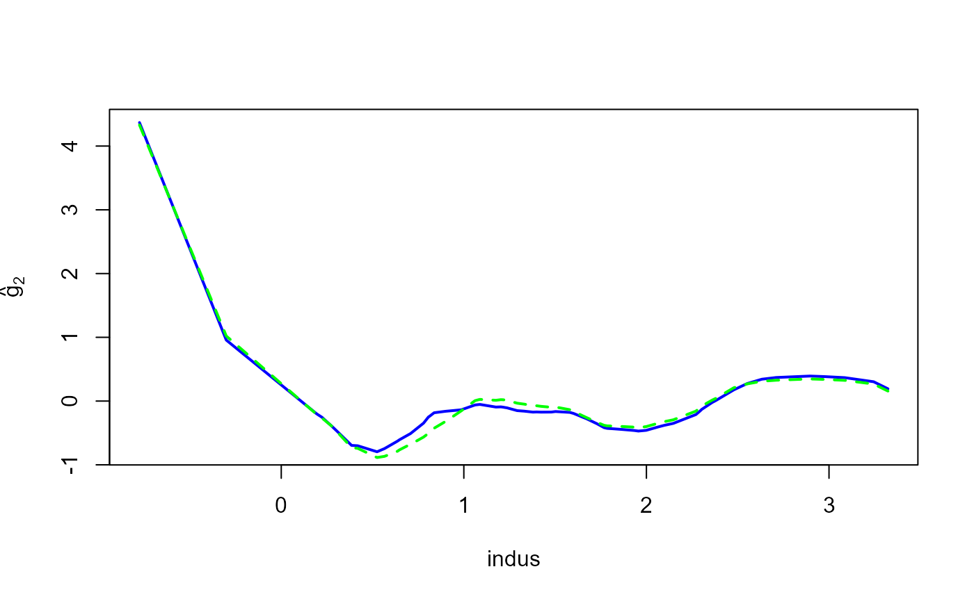 crim: per capita crime rate by town (\(X_1\)),indus: proportion of non-retail business acres per town (\(X_2\)),nox: nitric oxides concentration (parts per 10 million) (\(X_3\)),rm: average number of rooms per dwelling (\(X_4\)),age: proportion of owner-occupied units built prior to 1940 (\(X_5\)),dis: weighted distances to five Boston employment centers (\(X_6\)),tax: full-value property tax rate per 10,000 (\(X_7\)),ptratio: pupil-teacher ratio by town (\(X_8\)),black: \(1,000(Bk-0.63)^2\) where \(Bk\) is the proportion of people of Afrom American descent by town (\(X_9\)),lstat: percent lower status of population (\(X_{10}\)).The response variable \(Y\) is medv, the median value of the owner-occupied homes in 1,000 USD, and the proposed additive model is \[Y= \mu+ \sum_{j=1}^{10} g_j(\log(X_j))+ \epsilon.\] where \(\mu \in \mathbb{R}\), \(g_j\) are unknown smooth functions, and \(\epsilon\) are random errors.