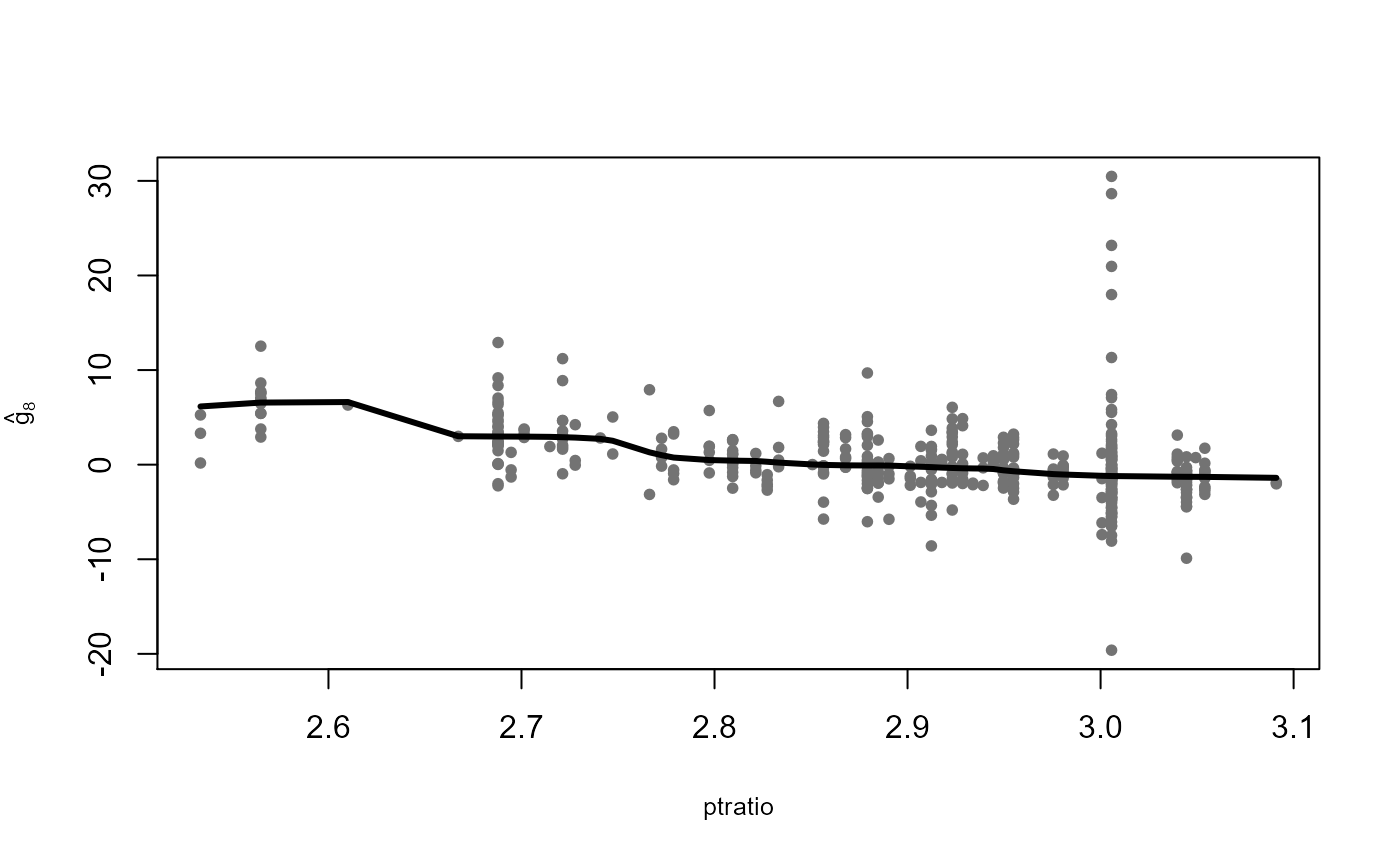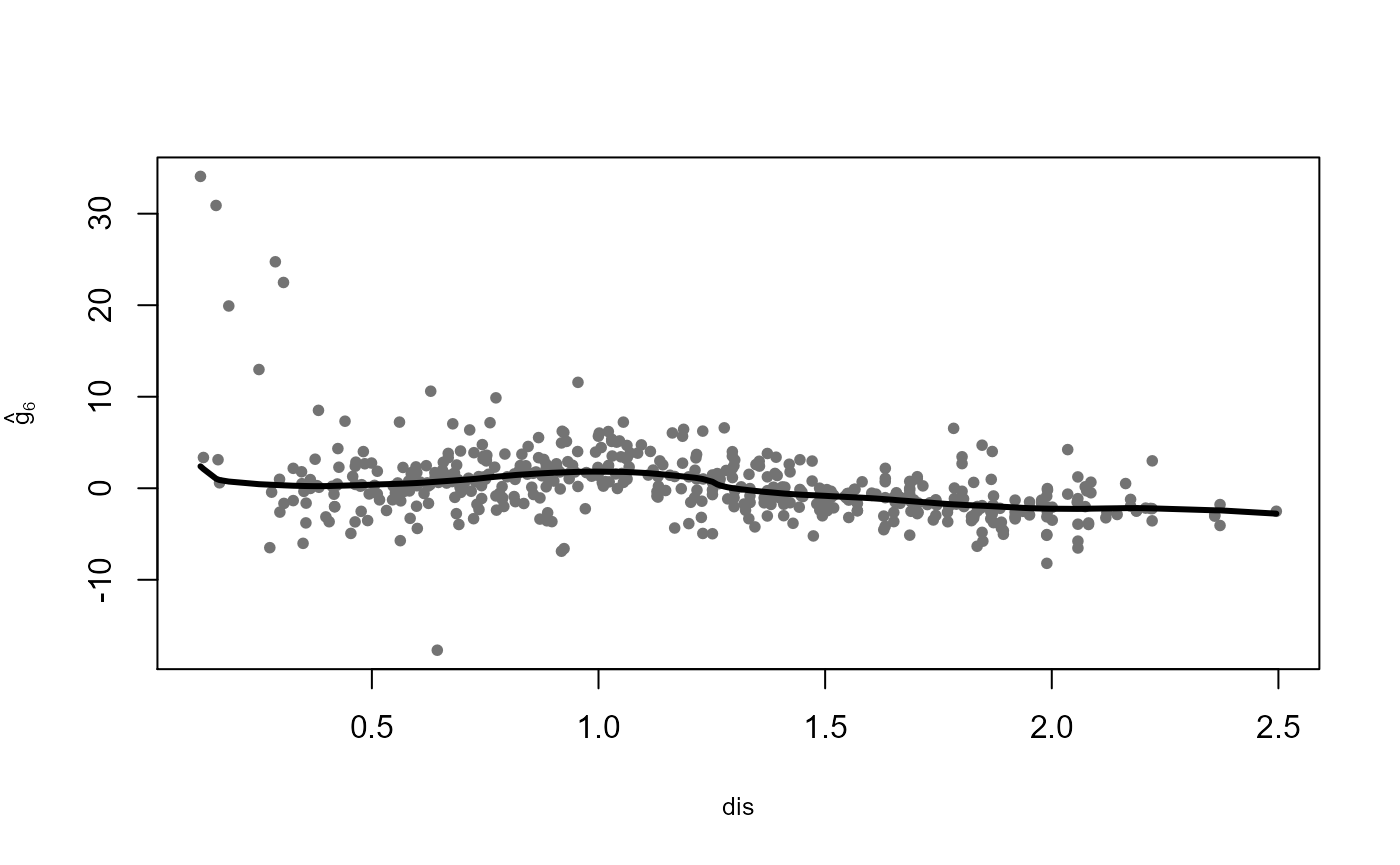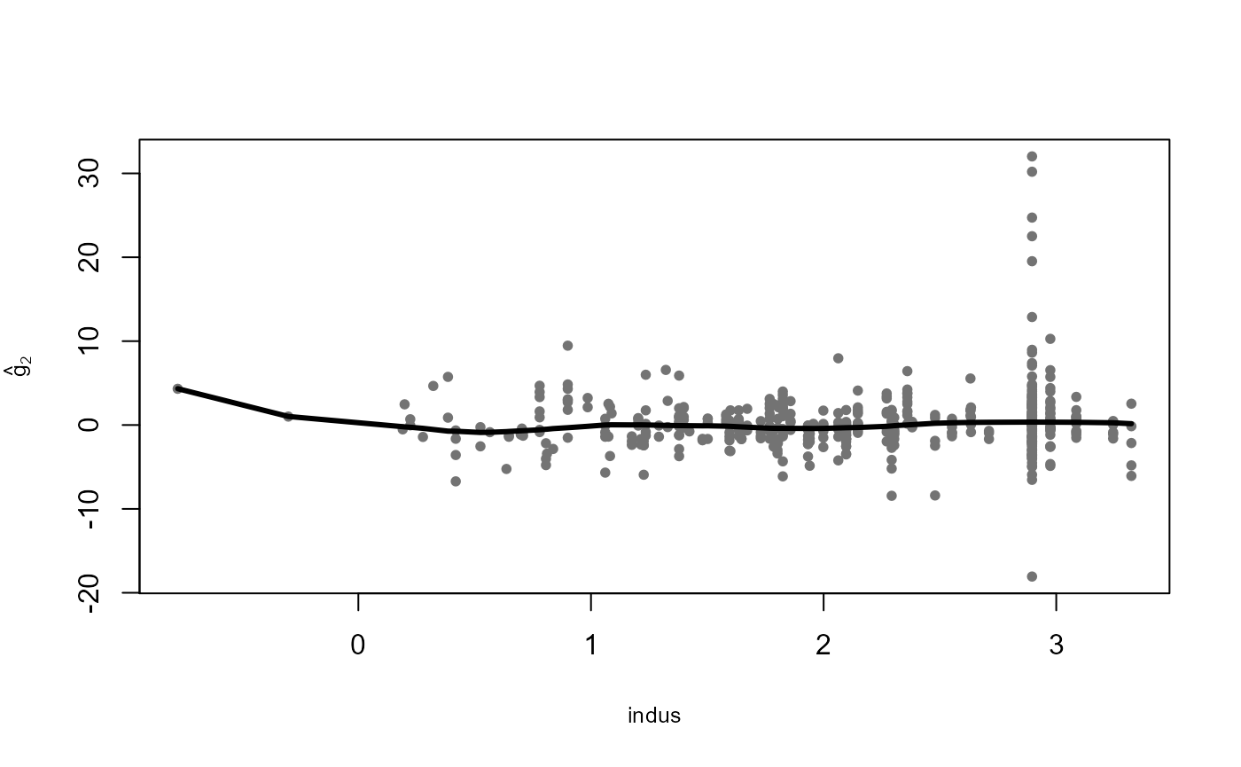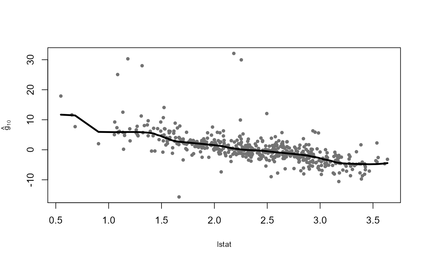 The plot method can be used to visualize the estimated additive components \(\hat{g}_j\), displayed over the corresponding partial residuals: \[ R_{ij}=Y_i-\hat{\mu}-\sum_{k\neq i}\hat{g}_k(X_{ik}) \, , \quad 1 \le i \le 506\, , \quad 1 \le j \le 10 \, . \]
