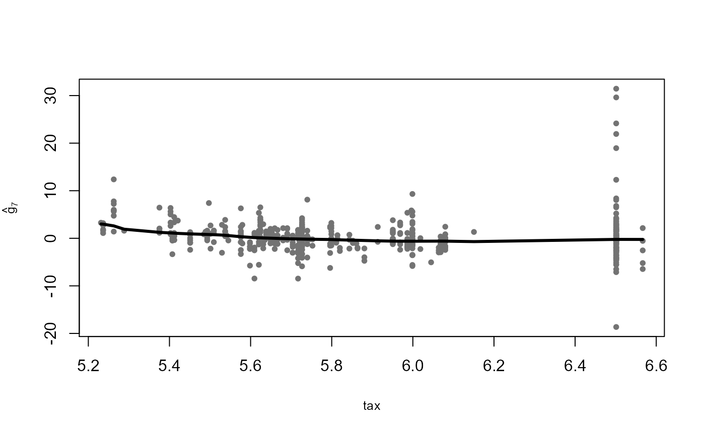 By default, backf.rob computes fitted values on the training set. If predictions at a different specific point are desired, we can pass those points using the argumen point. For example, to obtain predicted values at a point po given by the average of the (log transformed) explanatory variables, we can use the following command (note that this step implies re-fitting the whole model):