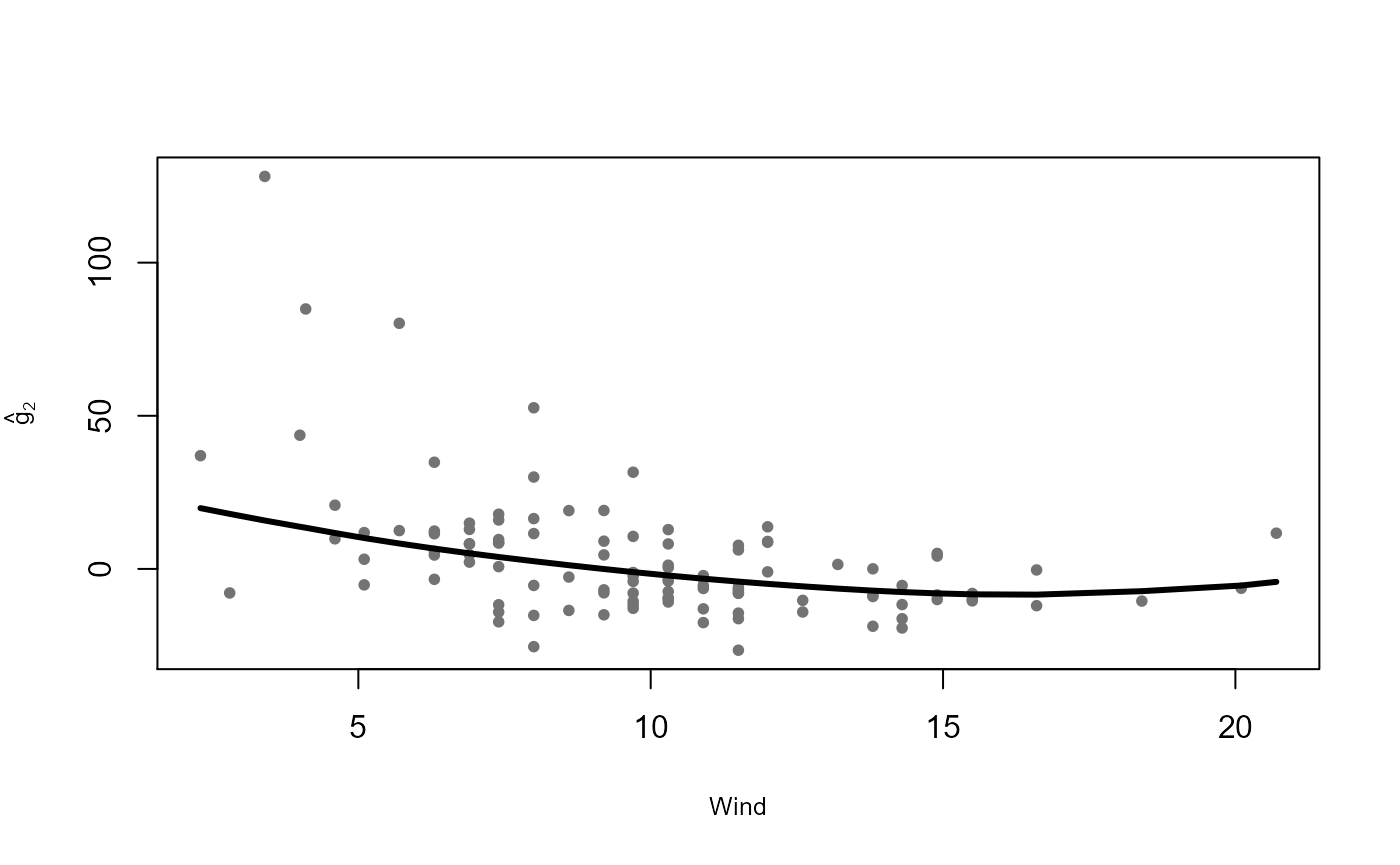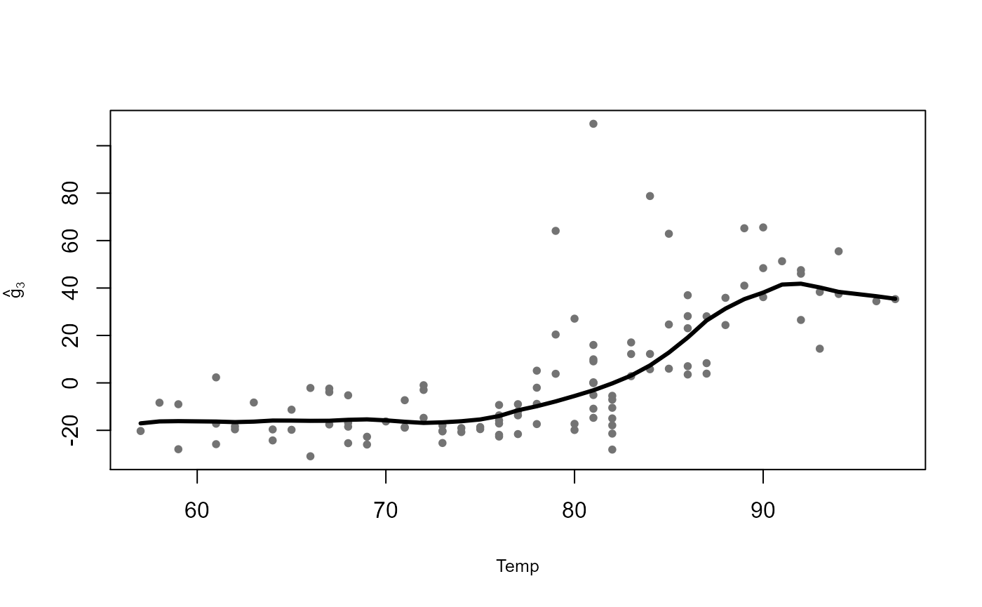 subset = ccs, data = airquality)We can visually explore the estimated additive functions plotted over the corresponding partial residuals using the method plot: