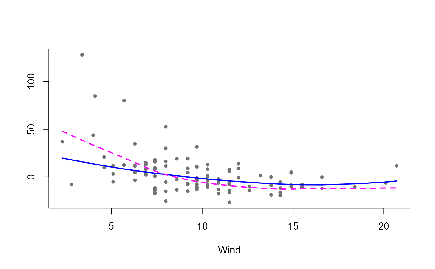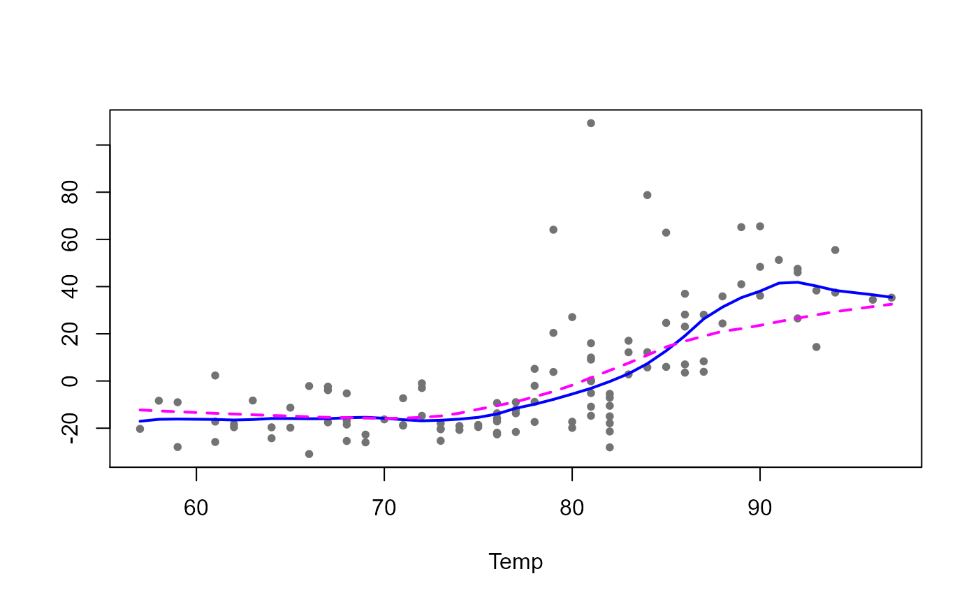 lo(Temp, span=.5), data = aircomplete)Both classical (in magenta and dashed lines) and robust (in blue and solid lines) fits are shown in the following plot together with the partial residuals obtained by the robust fit.